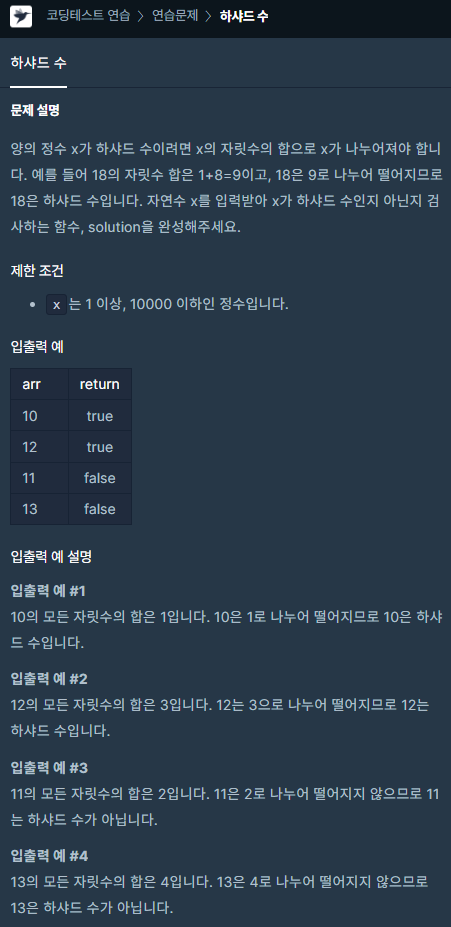 하샤드 수라는걸 처음 들어봐서 당황스러웠는데 어려운 개념이 아니어서 금방 이해할 수 있었다. 배열이 아닌 문자열의 수를 어떻게 계산하는지 생각해본 적이 없어서 구글링을 통해 알았는데 이미 내가 다 알고있던 것이었다. 문자열을 숫자로 변환하는 방법도 써본적이 없어서 구글링해서 알았다. 흠... 기억해놔야겠다.