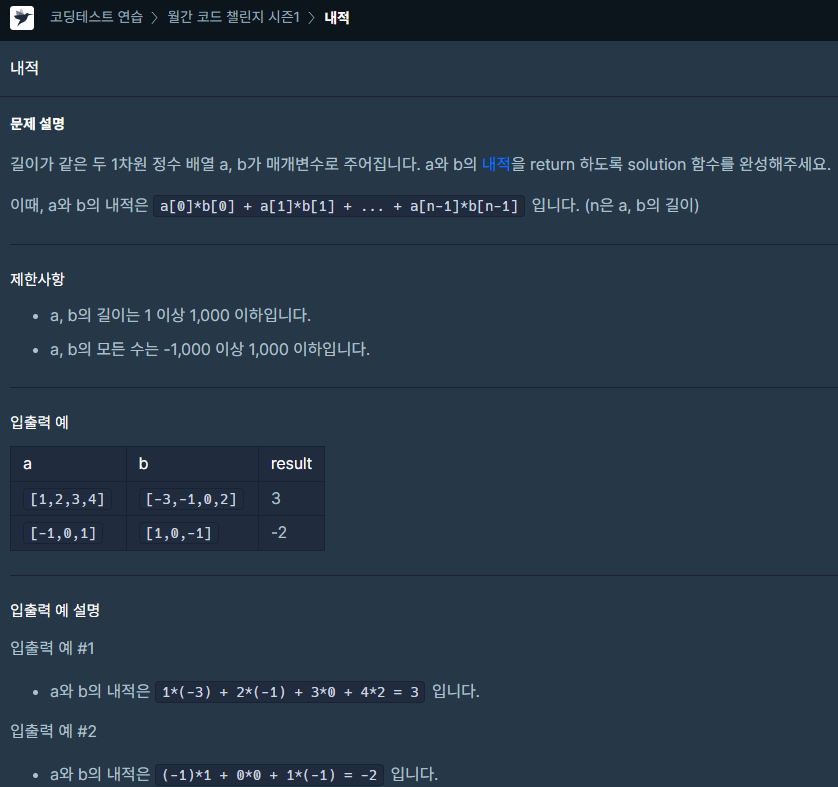 문제에서 내적이라는 글자를 보고 내적이 뭐였는지 기억이 안나서 매우 당황했는데 문제를 읽어보니 내적에 대한 설명이 자세히 적혀있어서 딱히 어려움은 없었다. 휴~ 이번에도 1점이군.