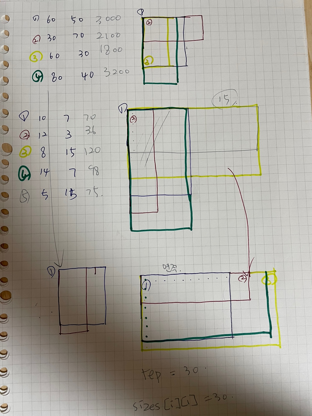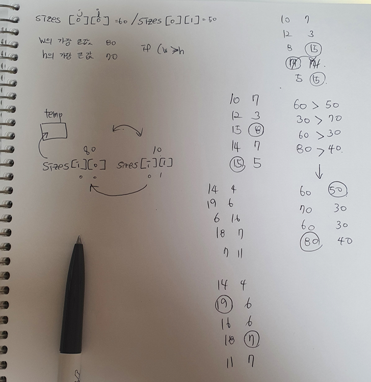 이틀에 걸쳐 푼 문제이다. 실제 고민하고 푼 시간은 3-4시간정도..? 뭐 하여튼 이틀동안 풀었고, 아 영 어떻게 이걸 알고리즘화 해야하는지 감이 안잡혔다. 80과 50이 최소직사각형이 된다는건 머리로는 이해가 가지만 왜 그렇게 될 수 있는지 논리적으로 설명하라고 하면 절대 못하는.. 그런 상태였다. 오늘도 열심히 고민하는 와중에 문제를 다시 읽어보았고, 문제에 '명함들을 적절히 회전'이라는 말에 꽂혔다. 회전... 그래 w, h 값을 회전하면 뭔가 실마리가 잡히려나? 하고 내 맘대로 w, h값의 순서를 바꾸어보았다. w와 h 값을 비교해서 더 큰 값을 w에 넣는 방식으로 해서 배열 내부의 순서를 바꿔보니 실마리가 잡혔다. 아 이게 말로 하려니 애매하게 설명이 안되는데 아래 내가 고민하면서 필기했던 내용을 첨부했다...