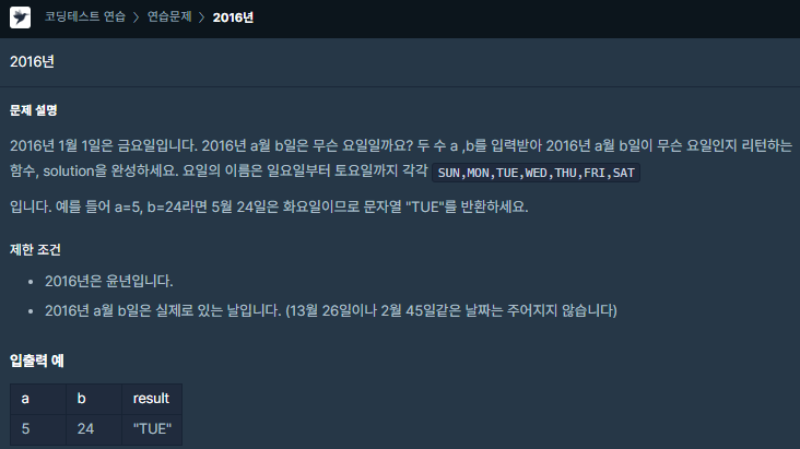 흠~ 대단해 생각하기 싫어서 노가다를 뛰어버렸다~ 윤년이 무엇인가 했더니 년도를 4로 나누었을 때 나머지가 0인 년도가 윤년이었다~~ 아니근데 홀수달은 전부 31일인걸로 알고 있었는데 알고보니 8월부터 짝수달이 31일이어서 중간에 뭐가 틀린지도 모르고 헤맸다.