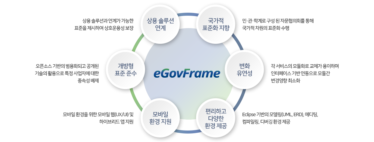 - 공공정보화 개발 기반을 표준화하여 사업자 종속성을 탈피하고, 소프트웨어 재사용성 등을 높이기 위해 전자정부 표준프레임워크를 개발하여 보급