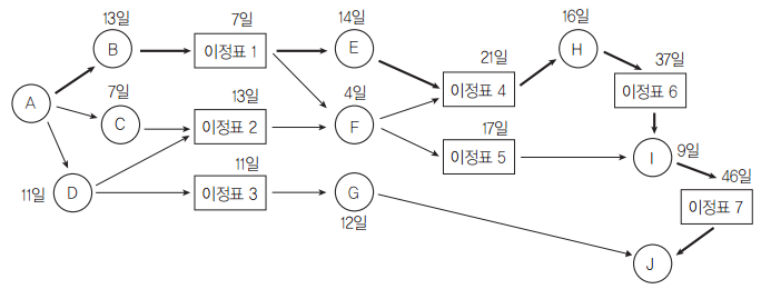 - 원형 노드는 각 작업을 의미하며 각 작업 이름과 소요기간을 표시하고, 박스 노드는 이정표를 의미하며 박스 노드 위에는 예상 완료 시간을 표시한다.