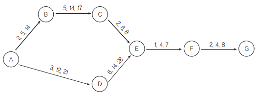 - 노드와 간선으로 구성되며 원 노드에는 작업을, 간선(화살표)에는 낙관치, 기대치, 비관치를 표시