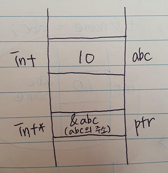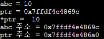 이렇게 되면 데이터를 저장하는 방 abc에는 10이 저장되고, 주소를 저장하는 방 ptr에는 abc의 주소가 저장된다.