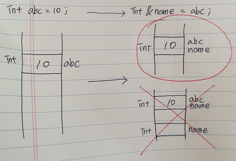 이제 abc공간에 있는 10이라는 값에 name도 이제 접근할 수 있다. int abc라고 적어서 abc공간이 생겼다면 int &name이라고 적었으니 name공간도 생긴것인가 싶지만 실제로는 생기지 않는다. name은 그저 abc공간을 부르는 또다른 이름이기 때문에 공간이 생기지 않는 것이다. 아래 그림 참고하자