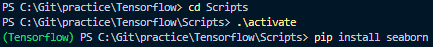 VS코드에서 생성한 Tensorflow 폴더로 다시 프로젝트를 열었으니 다시 가상 환경에 접속해준다. 그러고 seaborn 설치를 진행해준다.