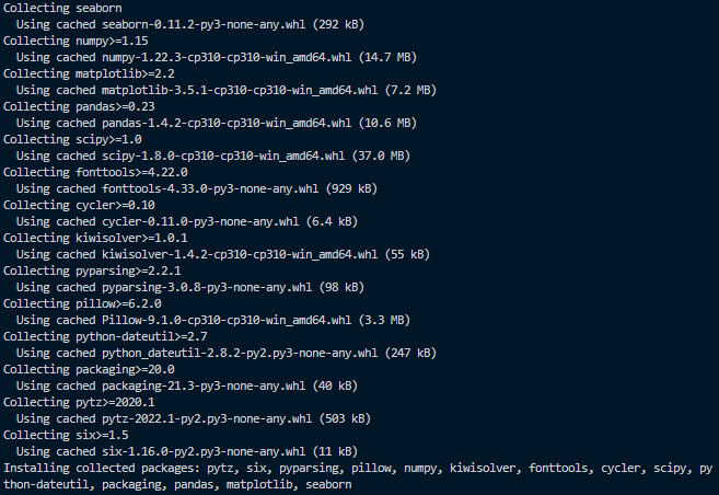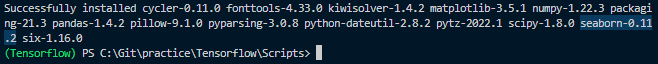 설치가 완료됐다 끝자락에 보면 seaborn이 설치된 걸 확인할 수 있다.