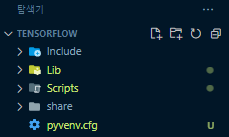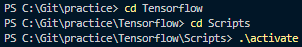 자 위 과정에서 만든 Tensorflow 폴더에 보면 여러 폴더와 파일들이 생성되어 있다. 그 중 Scripts 폴더에 들어가서 .\activate를 입력해 가상 환경에 접속해주면 된다.