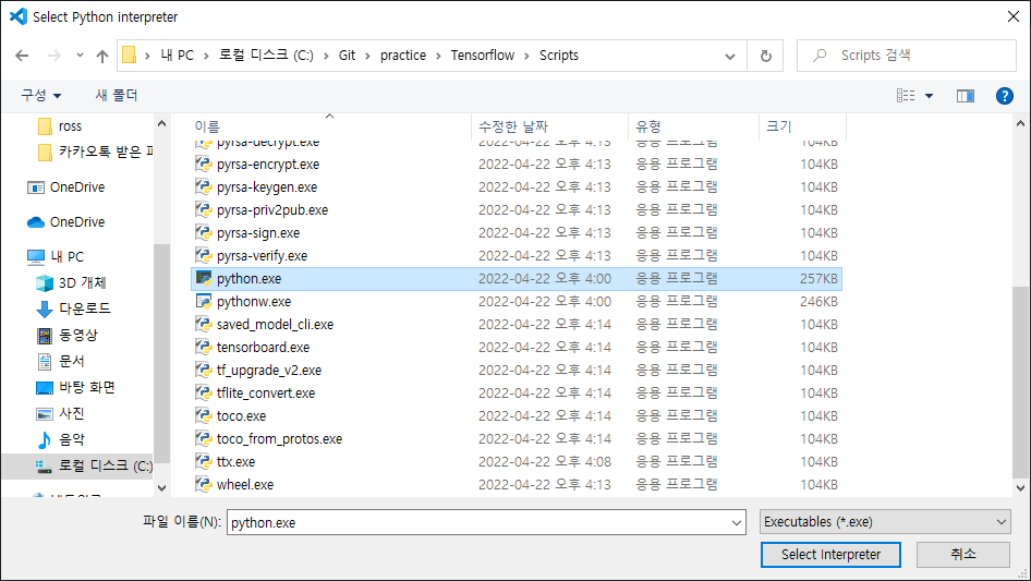 Tensorflow 폴더에서 Scripts 폴더로 들어가서 python.exe를 선택해준다.