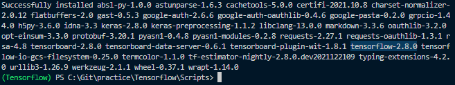 잘 설치가 되고 나면 위 과정과 동일하게 Successfully 블라블라 어쩌고저쩌고가 나온다. 여기서 나온 단어들을 쭉 읽다보면 tensorflow-2.8.0이라고 적혀있는게 보일 것이다. 성공적으로 설치가 되었다~~~ 야호!