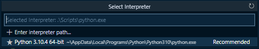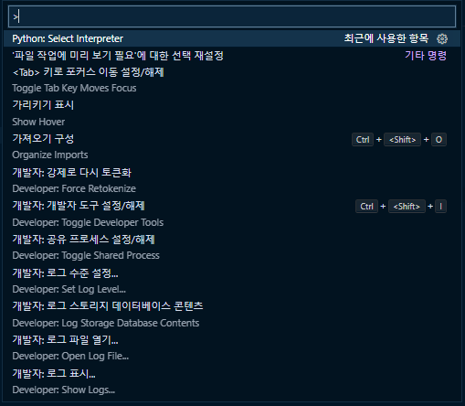 ctrl + shift + p 를 누르고 인터프리터를 설정해주는데 우선 Python: Select Interprter를 선택해준다.