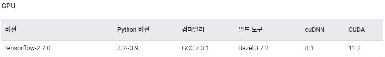 아래 링크에 들어가서 내 텐서플로우 버전과 맞는 쿠다 버전을 확인해준다.
