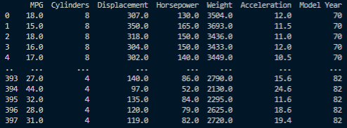 해당 예제는 Auto MPG 데이터셋을 사용하여 1970년대 후반과 1980년대 초반의 자동차 연비를 예측하는 모델을 만든다. 70년대 후반과 80년대 초반에 출시된 자동차 정보를 모델에 제공하겠다.