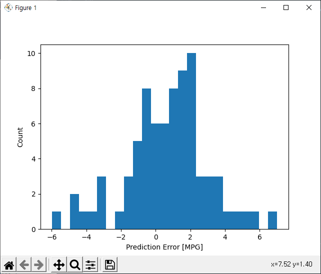 위 그래프를 보면 검증 세트의 평균 오차가 +/-2 MPG이다. 좋은 결과인지 아닌지는 내가 알아서 판단하자.(어.. 사실 모르겠다. 판단불가다.)