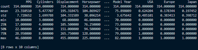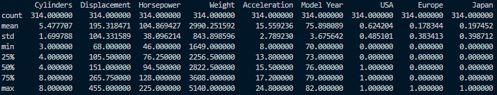 그 다음 데이터에서 Origin열은 수치형이 아니고 범주형이어서 원-핫 인코딩으로 변환할 것이다.