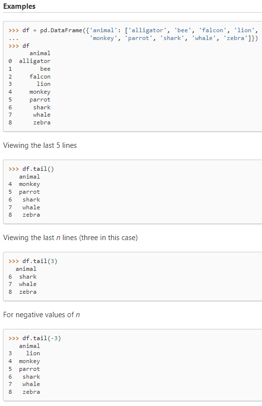 n이 양수일 경우 전체 행에서 밑에서 n개의 행을 출력한다. n이 음수일 경우엔 n개의 행을 제외하고 전부 출력한다. 아래의 예시를 확인하면 이해가 더 쉬울 것이다.