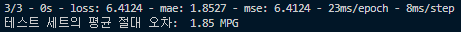 print("테스트 세트의 평균 절대 오차: {:5.2f} MPG".format(mae))