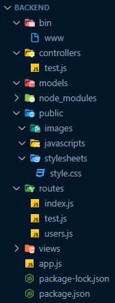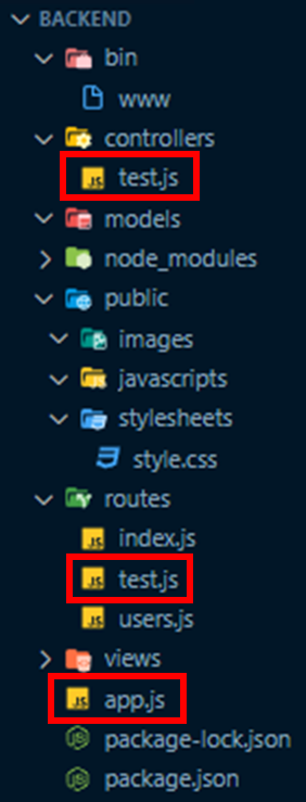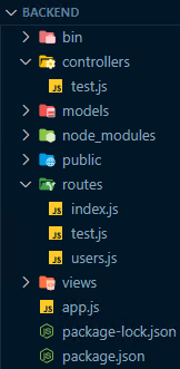 10. backend에도 controllers와 models 폴더를 만들어준다. 그리고 controllers 폴더 아래에 test.js 파일을 추가로 만들어준다. 아래 트리를 참고하자.