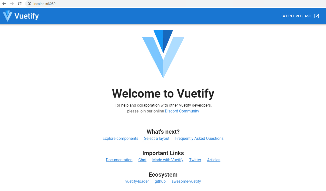 트리를 보면 vuetify.js 가 생겼을 것이다. 이제 vuetify 홈페이지에 가서 getStarted를 누르고 아래 소스를 긁어와서 생성된 vuefity.js의 소스를 뒤엎어줬다. 기존에 있던 소스는 다 지워버리고 긁어온 소스만 넣어준다.