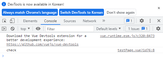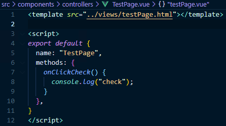 그 다음 controllers 폴더 > testPage.vue 파일도 다음과 같이 수정해주자. 클릭메소드를 생성해 주었다. 버튼을 클릭하면 콘솔창에 "chekc"라고 출력될 것이다.