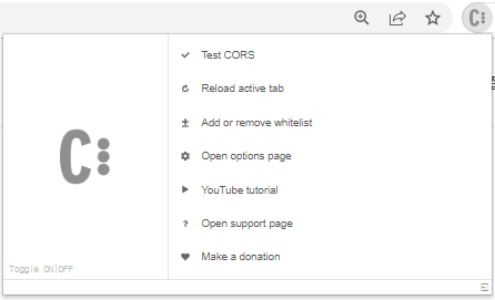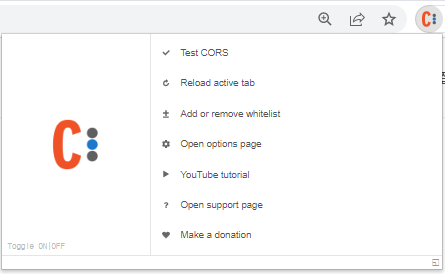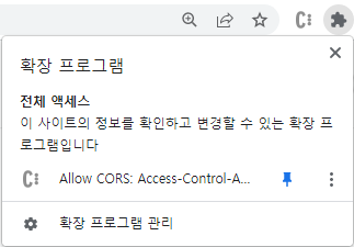 위 링크로 들어가서 크롬에 CORS를 설치해주고 크롬 URL뜨는 자리 오른쪽에 아래캡쳐화면처럼 퍼즐모양이 생겼을 것이다.