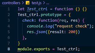 이제 contorller 폴더 안에 만들어준 test.js 파일에 아래과 같이 소스를 작성해준다.