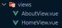 views 폴더에 아래와 같이 vue 파일 2개가 저장되어 있는데, Home화면을 나타내는 HomeView.vue파일과 About이라는 화면을 나타내는 AboutView.vue파일로 구성되어 있다. 만약 구현하려는 페이지 UI를 늘리려면 이 .vue 파일도 같이 늘어난다.
