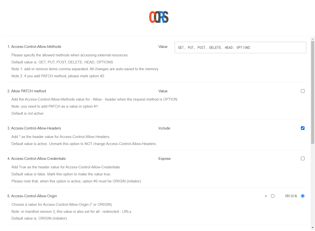 그 다음에 데이터를 주고 받게 되면 또 CORS 에러가 발생하는데 그때는 위의 CORS 창에서 Open options page를 눌러서 옵션페이지로 넘어간다. 아래 화면이 옵션페이지인데 3번에 Access-Control-Allow-Headers의 체크박스가 체크되어있지 않을 것이다. (나는 에러 잡는다고 이미 클릭해놓은 것이다.) 저 3번 체크박스에 체크를 해주면 이 에러도 잡히게 된다.