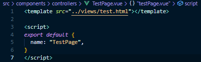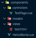 자, 그 다음 이 test.html의 정보를 가지고 있을 vue파일을 만들어 주겠다. 생성해준 contollers폴더에 TestPage.vue 파일을 만들어 주고 그 안에 아래와 같이 작성해줬다.