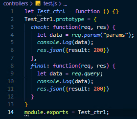그리고 controllers 폴더의 test.js 파일은 아래와 같이 수정해준다.