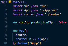라우터 추가하면 src>main.js에도 라우터 소스가 추가 된다. 아래 소스에서 3번 라인과 8번 라인에 라우터 소스가 추가된 것을 볼 수 있다.