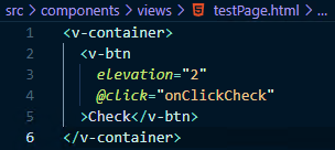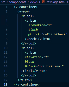 components폴더 > views폴더 > testPage.html 파일에 소스를 아래와 같이 수정하자. 만약 vuefity를 설치하지 않았다면 첫 번째 소스화면말고 두 번째 소스화면으로 작성하면 동일하게 작동한다.