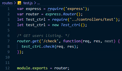테스트를 위해 routes 폴더 아래에 test.js 파일을 추가해준다. test.js 파일에 아래처럼 소스를 추가해주었다.