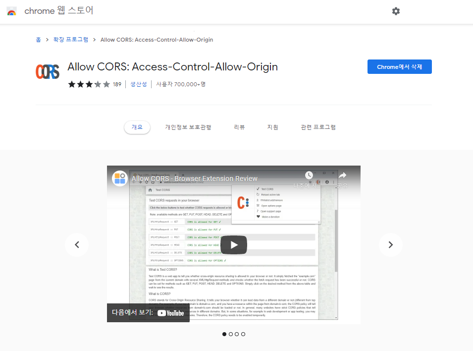 + 그리고 중간에 CORS에러가 발생하는데 크롬에서 제공하는 프로그램을 설치해서 해결했다.