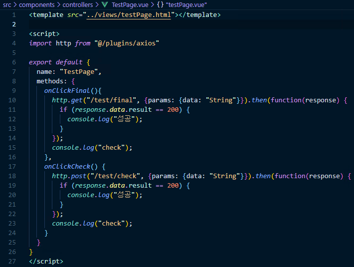 이제 contollers 폴더에 있는 testPage.vue 소스를 아래와 같이 수정해보자.