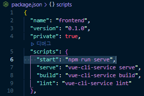 아래 그림을 보면 package.json 파일 안에 scripts 부분에 start라는 문구를 저장했다. 그럼 npm start만 입력해도 알아서 npm run serve가 실행된다.