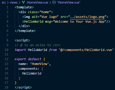 views 폴더 안에 알아서 생성된 HomeView.vue가 홈 화면이 디자인 되어 있는 소스인데, 소스를 보면 1~6번 라인은 HTML이고, 8~18번 라인은 스크립트로 작성되어 있다. HTML은 최소화 시키고 스크립트를 사용하자.