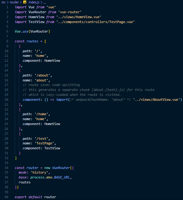 라우터 소스에서 9~19번째 라인을 보면 path, name, componet가 있는데 path는 내가 지정해줄 URL 경로 이름이다. name은 뭔지 모르겠고 component는 해당 path로 들어왔을 때 띄워지는 vue를 말한다. 소스 9번째 라인에 /로 지정된 라우터를 보면 component가 HomeView로 되어 있지 않은가? 그건 3번째 줄에 HomeView.vue가 있는 위치를 HomeView라는 명칭으로 import해줬기 때문에 간단하게 적을 수 있었던 것이다. 소스 19번째 라인을 보면 좀 복잡하게 적혀있지 않은가? 저것도 import를 해주면 간단하게 작성할 수 있을 것이다.