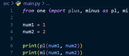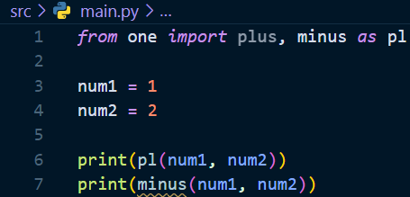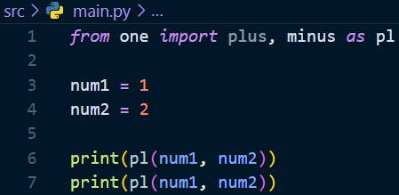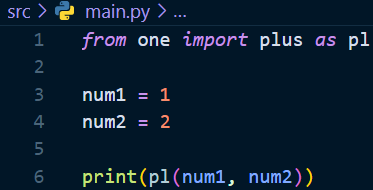 임포트할 함수에 별칭을 붙여서 간단하게 사용할 수 있다. 임포트 할 때 함수명 뒤에 as 별칭 형태로 추가 작성해주면 된다. 간단하다. 아래를 보면 main.py파일에서 호출할 one파일의 plus 함수에 pl이라는 별칭을 붙어줬다. 이제 함수명plus 대신 pl이라고 적어서 메소드를 사용할 수 있다.