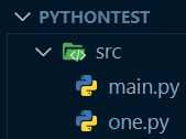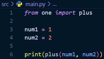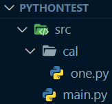 위에 트리를 보면 src폴더 내에 main.py파일과 cal폴더가 있다. cal폴더에는 one.py파일이 들어있다. one.py가 main.py파일의 하위폴더에 위치하는데 이 때 one.py에 있는 함수를 호출하는 방법은 아래와 같다.